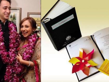 आमिर खानचा भाचा इमरान खानच्या लग्नाची पत्रिका एका डायरीप्रमाणे होती. हे एक ईयर प्लॅनर होते. ज्याच्या पहिल्याच पानावर पिनव्हील चिटकविण्यात आले होते. याच पानावर एक चिटदेखील होते. ज्यामध्ये लग्नाबद्दलची संपूर्ण माहिती देण्यात आली होती.