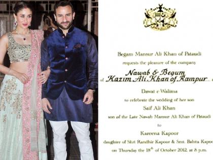 करिना कपूर आणि सैफ अली खान यांनी त्यांचे रिसेप्शन कार्ड अतिशय सिम्पल पद्धतीने छापले होते. मात्र त्यास रॉयल टचदेखील दिला होता. दोघे १६ आॅक्टोबर २०१२ रोजी लग्नाच्या बंधनात अडकले होते. पुढे १८ आॅक्टोबर रोजी सैफीनाने त्यांच्या लग्नाची रिसेप्शन पार्टी दिली होती.