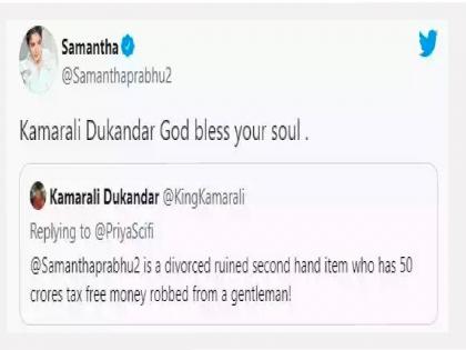 समंथा रुथ प्रभू एक घटस्फोटित सेकंड हँड आयटम आहे. जिने एका सभ्य पुरुषाचे टॅक्स फ्री ५० कोटी रुपये घेऊन पलायन केलं, अशी कमेंट या युजरने समंथाच्या पोस्टवर केली. ही कमेंट पाहिल्यावर अभिनेत्रीने त्याला प्रत्युत्तर दिलं आहे. तुमच्या आत्म्यास शांती लाभो, असं प्रत्युत्तर देत समंथाने या युजरची बोलती बंद केली आहे.