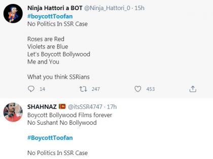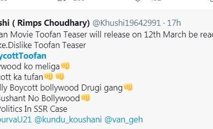 आता ‘तुफान’वर बहिष्कार का? तर या सिनेमाच्या रिलीजआधी नव्याने सुशांत सिंग राजपूतच्या मृत्यूचा मुद्दा त्याच्या चाहत्यांनी उचलून धरला आहे. सुशांतला न्याय मिळत नाही, तोपर्यंत आम्ही बॉलिवूडला बायकॉट करू, अशी भूमिका चाहत्यांनी घेतली आहे.