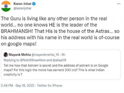 हे ट्विट शेअर करत करण जोहरने उत्तर दिले की, 'यात सीनमध्ये कोणताही दोष नाही, कारण पत्ता आश्रमाचा आहे. आश्रम जगातील इतर ठिकाणांसारखेच आहे. गुरु हा खऱ्या जगात इतर व्यक्तींसारखा जगतोय. तो ब्रह्मांशचा प्रमुख आहे, हे कुणालाच माहीत नाही. त्यामुळे त्यांचा पत्ता गुगल मॅपवर आहे!'