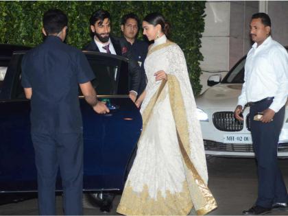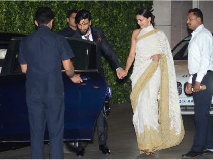 क्रिम रंगाच्या साडीतील दीपिका रणवीरसोबत अतिशय आनंदात असल्याचे यावेळी पाहायला मिळाले. दोघेही परस्परांची कंपनी एन्जॉय करत असल्याचे त्यांच्या बॉडी लँग्वेजवरून स्पष्टपणे दिसत होते. दीपिकाचा हात हातात घेण्यापासून तर तिच्यासाठी गाडीचा दरवाजा उघडण्यापर्यंतचे ‘जेन्टलमन’ रणवीरचे वागणे पाहून कुणीही भारावून जावे. मग दीपिका भाळली तर त्यात नवल कुठले?