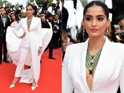 कान्समध्ये Quentin Tarantino's Once Upon A Time in Hollywood च्या प्रीमीअरदरम्यान ती या बोल्ड व्हाईट लूकमध्ये दिसली. व्हाईट ब्लेजरला अटॅच असलेले लॉन्ग विंग्स, स्ट्रेट पँट,बेल्ट असा तिचा लूक होता. या व्हाईट ड्रेससोबत ग्रीन मल्टी लेअर नेकलेस आणि ईअररिंग्स सोनमच्या सौंदर्यात भर घातल होते.
