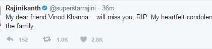 माझा प्रिय मित्र विनोद खन्ना...तुझी खुप आठवण येईल. मी त्याच्या कुटुंबियांचे सांत्वन करतो. त्यांच्या दु:खात सहभागी आहे.