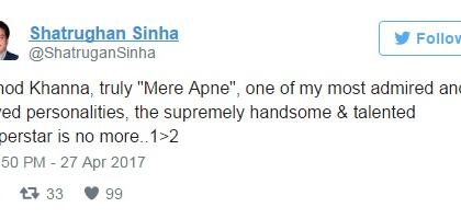 विनोद खन्ना सर तुमच्या आत्म्याला शांती लाभो. १९८०च्या दशकातील उत्तर भारतातील सर्व महिलांच्या स्वप्नातील तुम्ही राजकुमार होता. प्रत्येकाच्या मनात तुम्ही एक स्थान निर्माण केले होते. ते कायम राहील.