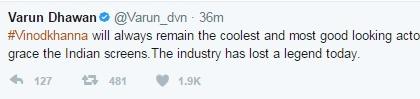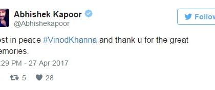 हॅण्डसम, उत्कृष्ट अभिनेता विनोद खन्ना यांना आज आपण गमावले आहे. मी नेहमीच त्यांनी फॅन असेन. तुमच्या आत्म्याला शांती लाभो.