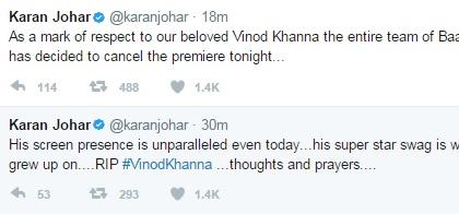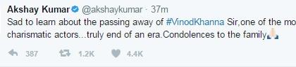 विनोद खन्ना सर गेल्याचे कळताच मला फार वाईट वाटले. उत्साहवर्धक अभिनेत्यांपैकी एक ते होते. त्यांनी जो काळ गाजवला तो आता त्यांच्यासोबतच संपला आहे. त्यांच्या कुटुंबियांचे मी सांत्वन करतो.
