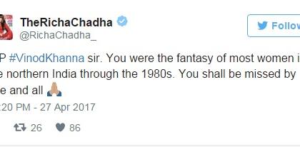 विनोद खन्ना सर तुमच्या आत्म्याला शांती लाभो. १९८०च्या दशकातील उत्तर भारतातील सर्व महिलांच्या स्वप्नातील तुम्ही राजकुमार होता. प्रत्येकाच्या मनात तुम्ही एक स्थान निर्माण केले होते. ते कायम राहील.