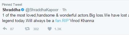 विनोद खन्ना खऱ्या अर्थाने माझा जवळचा होता. मला पाठिंबा देणारा आणि माझे सर्वांत आवडते व्यक्तिमत्त्व आणि हुशार सुपरस्टार आता आपल्यात नाही.