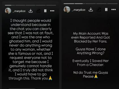 आणखी एक स्टोरी शेअर करत ती लिहिते, "माझं मेन अकाऊंट रिपोर्ट केलं गेलं आणि तिच्या चाहत्यांनी ते ब्लॉक केलं. मी काय चुकीचं केलंय? उलट मी एका चीटरपासून तिला वाचवलंच आहे. कृपया माझ्यावर विश्वास ठेवा."
