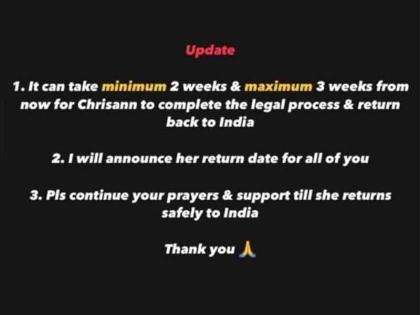 क्रिसनच्या कुटुंबीयांनी तिच्या चाहत्यांना सांगितले की, सध्या क्रिसॅन तिथे कायदेशीर प्रक्रिया पूर्ण करते आहे. ती प्रक्रिया पूर्ण केल्याशिवाय ती भारतात येऊ शकत नाही. त्यामुळे तिला भारतात परत येण्यासाठी तिला कमीत-कमी दोन ते जास्तीत जास्त तीन आठवडे लागू शकतात. ती भारतात सुखरूप परत येईपर्यंत तिच्यासाठी प्रार्थना करा. धन्यवाद.'