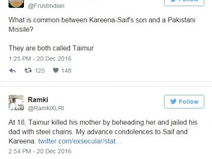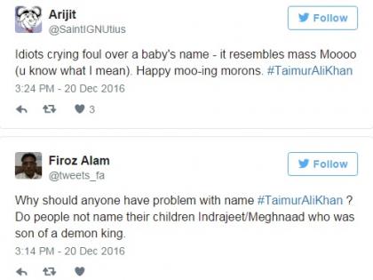 ब लिवूडचं हॉट कपल सैफ अली खान आणि करिना कपूर खान यांच्या बाळानं मुंबईच्या ब्रीच कँडी रूग्णालयात जन्म घेतला. पतौडी खानदान आणि कपूर कुटुंंबियांनी मिळून बाळाचे नाव ‘तैमूर अली खान’ असे ठेवले. सैफने लगेच त्याच्या नामकरणाची गोड बातमी चाहत्यांसोबत ट्विटरवर शेअर केली. मग काय? त्याला काहींच्या शुभेच्छा येऊ लागल्या तर ‘तैमूर’ या नावाला विरोध करत अनेकांचे टिवट्स धडकू लागले. विविध धार्मिक संस्था, सामाजिक संस्था तसेच अनेक व्यक्ती त्यांच्या वैयक्तिक अकाऊंटवरून या नावाला विरोध दर्शवत आहेत. या नावावरून चांगलेच वादंग माजल्याचे चित्र ट्विटरवर दिसतेय. या नावातून कथित होणाऱ्या विविध अर्थांवर टिवटिवाट सुरू झालाय. पाहूयात, नेमकं काय आहे हा वाद-प्रतिवाद...