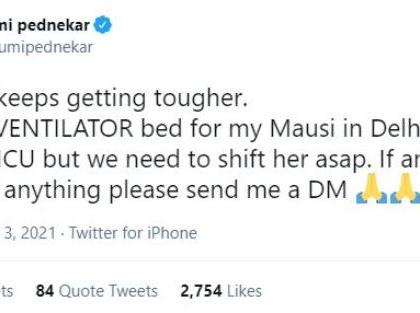 24 तासांत मी माझ्या दोन अतिशय जवळच्या व्यक्ति गमावल्या. ज्यांच्यावर आमचे खूप प्रेम होते. अन्य 3 जवळच्या नातेवाईकांची प्रकृती गंभीर आहे. संपूर्ण दिवस त्यांच्यासाठी ऑक्सिजन व बेड्स शोधण्यासाठी घालवला. दु:खासाठी जागा नाही. आता फक्त अॅक्शन. खरोखर हे संपण्याची वाट बघू शकत नाही. कृपया थोडे योगदान द्या, असे तिने एका ट्विटमध्ये म्हटले आहे.