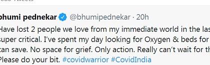 दिल्लीतील माझ्या मावशीला तातडीने व्हेंटिलेटर बेड हवा आहे. ती आयसीयूमध्ये आहे. पण तिला तातडीने हलवावे लागणार आहे. मदत करू शकत असाल तर कृपया कळवा... मी हात जोडून विनंती करते, असे ट्विट भूमीने केले.