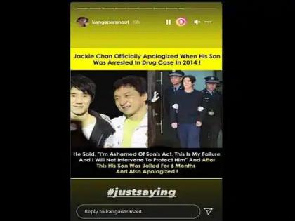 कंगनाने ही पोस्ट आपल्या इंस्टाग्राम अकाउंटवर शेअर केली आहे. यात स्पष्टपणे दिसत आहे, की जॅकीने 2014 मध्ये आपला मुलगा जॅसीला ड्रग्स प्रकरणात अटक झाल्यानंतर कशा प्रकारे सार्वजनिक माफी मागितली होती. जॅसीला पोलिसांनी बिजिंगमधील त्याच्या अपार्टमेंटमधून 100 ग्रॅम गांजासह अटक केली होती. यानंतर जॅकीने सोशल मिडिया साईटवर लिहिले होते की, 'एक पब्लिक फिगर म्हणून मला लाज वाटत आहे आणि मी अत्यंत दु:खी आहे. त्याची आई देखील दु:खी आहे. मी जॅसीसह जनतेची जाहीरपणे माफी मागतो. ही पोस्ट शेअर करत, 'मी फक्त सांगत आहे,' असे कंगनाने लिहिले आहे.
