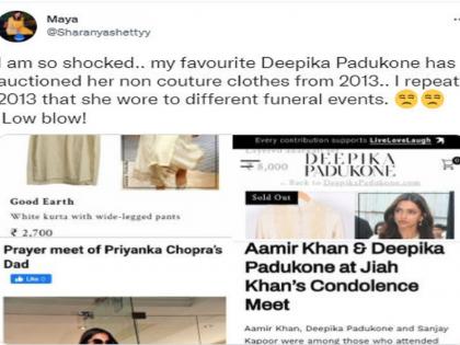 एका युजरने केलेल्या दाव्यानुसार, दीपिकाने जे कपडे लिलावात काढले आहेत, ते तिने अभिनेत्री जिया खान व प्रियंका चोप्राचे वडील अशोक चोप्रा यांच्या अंत्यसंस्कारावेळी घातले होते. शरण्या शेट्टी असे दावा करणा-या युजरचे नाव आहे. ‘मी हैराण आहे... माझी आवडती अभिनेत्री दीपिका पादुकोणने 2013 मध्ये घातलेले कपडे लिलावात काढले आहेत. हे कपडे डिझाईनर नाहीत. 2013 साली दोन वेगवेगळ्या अंत्यसंस्कारावेळी तिने हे कपडे घातले होते,’ असे ट्वीट या युजरने केले आहे.