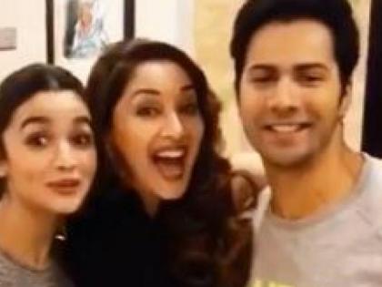 आ ले स्मित हास्य, लटके झटके आणि दिलखेचक अदांनी तरुणांची मने घायाळ करणारी धकधक गर्ल आणि हिंदी चित्रपटसृष्टीची खरीखुरी डान्सिंग क्वीन म्हणजे माधुरी दीक्षित.आता हीच अभिनेत्री कलाकारांसाठीही डान्स गुरु बनल्याचे पाहायला मिळत आहे.माधुरी आलिया भट्ट आणि वरुण धवन या तिघांचा एक फोटो सोशल मीडियावर व्हायरल झाला आहे. या फोटोत माधुरी या दोघांना डान्स शिकवताना दिसत आहे. आगामी ‘कलंक’ या सिनेमासाठी आलिया आणि वरूण माधुरीकडून डान्सचे धडे घेत असल्याचे बोलले जात आहे.'बकेट लिस्ट'नंतर ती दुसऱ्यांदा करण जोहरसोबत काम करते आहे. याआधी माधुरीने करण जोहरचा चित्रपट 'ये जवानी है दीवानी'मध्ये डान्स केला होता.