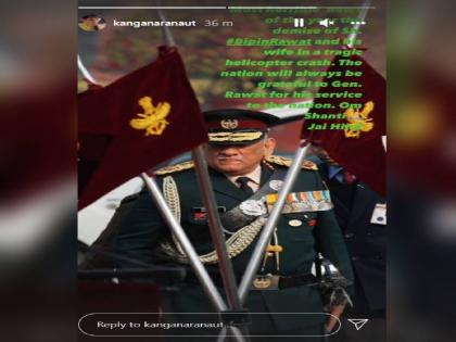 दरम्यान, विवेक ओबेरॉय, कबीर बेदी यांच्यासोबत अभिनेत्री कंगना रणौत आणि सोफी चौधरीने देखील बिपीन रावत यांना आदरांजली वाहिली आहे. कंगनाने तिच्या इन्स्टाग्राम स्टोरीमध्ये एक पोस्ट शेअर करत बिपीन रावत यांना श्रद्धांजली अर्पण केली आहे.