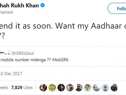श हरूख खान इंडस्ट्रीत हजरजबाबी म्हणून ओळखला जातो. आपल्या चाहत्यांसोबतही शाहरूख अनेकदा मस्करी करताना दिसतो. twitter अकाऊंटवर चाहत्यांच्या प्रश्नांला शाहरूख अशीच मजेशीर उत्तरे देताना दिसतो. ताजे उदाहरण द्यायचे झाल्यास त्याचे हे tweet तुम्ही वाचायलाच हवे. एका चाहत्याने अगदी निरागसपणे शाहरूखकडे एक विनंती केली. पण सरळ बोलेल तो शाहरूख कुठला. त्याने या चाहत्याची मस्तपैकी फिरकी घेतली. आता हा सगळा किस्सा तुम्हाला सांगायलाच हवा. तर त्याचे झाले असे की, एका चाहत्याने शाहरूखला त्याचा मोबाईल नंबर मागितला. ‘तू तुझा नंबर मला देशील? असा प्रश्न या चाहत्याने शाहरूखला केला. यावर शाहरूखने काय उत्तर दिले माहितीयं? होय, पाठवतो ना. आधार क्रमांकही पाठवू का? असे शाहरूखने लिहिले.