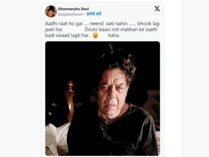 धर्मेंद्र यांनी आज शुक्रवारी पहाटे ३ वाजून ५२ मिनिटांनी एक पोस्ट शेअर केलीय. या पोस्टमध्ये धर्मेंद्र यांचा चेहरा थकलेला दिसत असून त्यांच्या पायावर प्लास्टर लागलेलं दिसतंय. "अर्धी रात्र झालीय.. झोप येत नाहीय.. भूक लागतेय.. मित्रांनो शिळी रोटी लोणीसोबत खुप चविष्ट लागते." धर्मेंद्रच्या या फोटोखाली फॅनने कमेंट करुन लिहीलंय की, "सर तुमच्या पायाला काय झालंय." त्यावर धर्मेंद्र यांनी उत्तर दिलंय की.. "माझा घोटा फ्रॅक्चर झालाय.. तुम्हा सर्वांचा आशिर्वादाने लवकरच तंदुरुस्त होईल."
