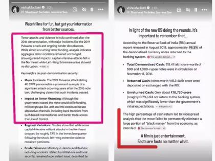 विशाल ददलानी 'धुरंधर २' सिनेमाचं नाव न घेता पोस्टमधून टीका केली आहे. "मनोरंजनासाठी सिनेमा बघा, पण माहिती ती योग्य सोर्सकडूनच मिळवा. सध्या जे काही सुरू आहे त्यामुळे हे लक्षात ठेवणं गरजेचं आहे की काहीही झालं तरी सत्य हे सत्य असतं", असं त्याने पोस्टमध्ये लिहिलं आहे. या स्टोरीमध्ये त्याने नोटबंदीसंबंधी काही आर्टिकलही शेअर केले आहेत. या पोस्टमध्ये असं म्हटलं गेलं आहे की २०१६ मध्ये नोटबंदी झाल्यानंतरही देशात दहशतवादी हल्ले बंद झाले नाहीत. २०१९ मध्ये पुलवामामध्ये आतंकवादी हल्ला झाला होता आणि आताही बॉर्डरवर तणावपूर्व स्थिती आहे. नोटबंदीचा उद्देश टेरर फंडिंगवर नियंत्रण आणणं होतं मात्र त्यामुळे दहशतवादी हल्ल्यांवर काहीच परिणाम झाला नाही.
