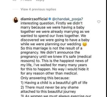 दिया मिर्झाच्या प्रेग्नंसीवरुन एका युजरने तिला कमेंट करत सांगितले की, 'ही चांगली गोष्ट आहे, तुम्हाला खूप शुभेच्छा. लग्नातही पुरुषाऐवजी एका महिला पंडित पुजा-याने धार्मिक विधी केल्या एकंदरित लग्नात पारंपरिक विधींना फाटा देण्यात आला होता. तर मग स्त्री लग्नाआधी गर्भवती का होऊ शकत नाही? विचारलेल्या प्रश्नावर दीया म्हणाली की, हा एक चांगला प्रश्न आहे.