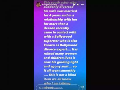 तिच्या इन्स्टा स्टोरीत ती लिहिते, ‘एका साऊथ अॅक्टरने लग्नाच्या 4 वर्षानंतर आणि 10 वर्षांपेक्षा अधिकच्या रिलेशनशिपनंतर अचानक पत्नीला घटस्फोट दिला. हा साऊथ अभिनेता अलीकडे बॉलिवूडच्या एका सुपरस्टारच्या संपर्कात होता. ज्याला बॉलिवूडच्या घटस्फोटाचा तज्ज्ञ मानलं जातं. त्याने अनेक महिला व मुलांचं आयुष्य बर्बाद केलं. अनेकांना त्यानं भडकवंल. मी कोणाबद्दल बोलतेय, ते सर्वांनाच ठाऊक आहे.’ कंगनाच्या या पोस्टमध्ये बॉलिवूडच्या त्या सुपरस्टारचे नाव नाही. पण तिचा इशारा आमिर खानकडे आहे, हे कोणापासूनही लपून राहिलेलं नाही.