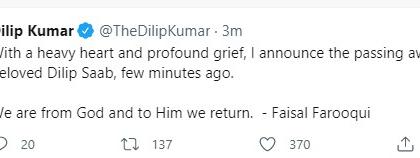 दिलीप कुमार यांना श्वासोच्छवासाचा त्रास होत होता. यामुळे त्यांना हिंदुजामध्ये गेल्या महिन्यात दाखल करण्यात आले होते. त्यांची पत्नी सायरा बानू यांनी त्यांना हॉस्पिटलमधून घरी नेण्याची इच्छा व्यक्ती केली होती. यानुसार हॉस्पिटलने दिलीप कुमार यांना नुकताच डिस्चार्ज दिला होता. आज पहाटे त्यांची प्राणज्योत मालवली.