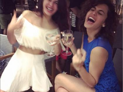 या फोटोंमध्ये जॅकलिन नेहमीप्रमाणे कमालीची सुंदर दिसतेय. ती केवळ मस्तीच्या मूडमध्ये आहे, हे फोटो पाहिल्यानंतर लगेच लक्षात येते. तापसीसोबतचा एक फोटो जॅकने शेअर केला आहे आणि त्याच्या कॅप्शनमध्ये तापसीला स्वत:ची ड्रिंकिंग पार्टनर म्हटले आहे. आम्ही दोघींनी वाईनच्या ग्लासमध्ये निंबू पाणी पिले, असे तिने लिहिलेय.