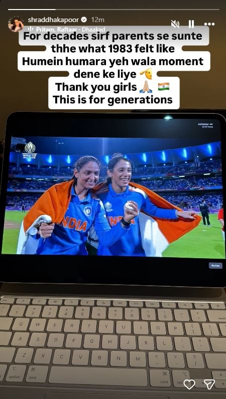 अभिनेत्री श्रद्धा कपूरने भारतीय महिला क्रिकेट संघाला शुभेच्छा देताना म्हटलं की, ''अनेकदा वर्ष आई-बाबांकडून १९८३ च्या वेळी काय भावना होती हे ऐकत आलोय. कदाचित ही भावना आज आम्हाला जगायची असेल. मुलींनो खूप धन्यवाद. या पिढीत हा विजय महत्वाचा आहे.''