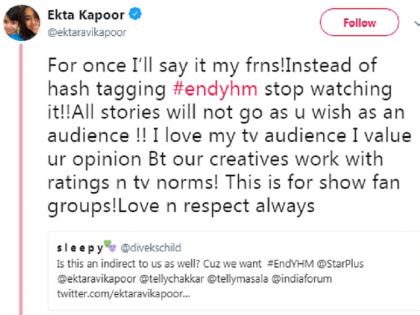मी लोकांना सांगू इच्छिते की, एंडवायएचएम मोहिम चालवण्याऐवजी ही मालिका पाहणे बंद करा. सर्व कथा प्रेक्षकांच्या आवडीच्या हिशेबाने दाखवता येत नाहीत. मी माझ्या टीव्ही प्रेक्षकांवर प्रेम करते़ त्यांच्या विचारांचा आदर करते. पण आमचे रचनात्मक काम टीव्ही रेटींग आणि मापदंडांनी चालते. हा शो चाहत्यांसाठी आहे़ प्रेम आणि आदर नेहमीसाठी़...असे या मालिकेचा विरोध करणा-यांना एकताने बजावले आहे.