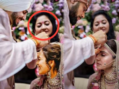 नेहा आणि रोहनप्रीतने विरुष्काला कॉपी केली असे म्हटलं जाते आहे. पण हे फोटो जर आपण नीट पाहिले तर आपल्या लक्षात येईल की सोशल मीडियावर फिरणारे फोटो मॉफ केलेले आहेत. हा फोटो आपण नीट बघितला तर लक्षात येईल दोनही फोटोंमध्ये मागे उभी असलेली स्त्री सारखीच आहे. ऐवढंच नाही तर विराट आणि रोहनप्रीतच्या हातातील धागादेखील सारखाच आहे.