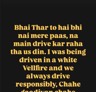 बाहशहाने त्याच्या सोशल मीडिया अकाउंटवरून एक पोस्ट शेअर केली आहे. त्याद्वारे त्याने या सगळ्या आरोपाचं खंडण केलं आहे. इन्स्टाग्रामवर स्टोरीच्या माध्यमातून बादशहाने लिहिलंय, "भाई! माझ्याकडे तर थार गाडीच नाही आहे. शिवाय त्या दिवशी मी गाडी चालवत नव्हतो. तेव्हा मी माझ्या व्हाईट वेलफायरमधून जात होतो. आम्ही नेहमीच जबाबदारीने वाहतूक करतो. मग ती गाडी असो किंवा गेम!" असं त्याने म्हटलं आहे.