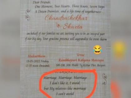 चंद्रशेखर नावाचा व्यक्तिची ही लग्न पत्रिका आहे. चंद्रशेखर 13 मे रोजी कर्नाटकातील बेलेगावी येथे श्वेतासोबत लग्न करणार आहे. त्याने आपल्या लग्नपत्रिकेवर लिहिले आहे, "लग्न, लग्न, लग्न, मला ते आवडत नाही, मी टाळतो, पण माझ्या नातेवाईकांना लग्न आवडते, मी ते टाळू शकत नाही." सोशल मीडियावर सध्या ही पत्रिका वाऱ्यासारखी व्हायरल होतोय.