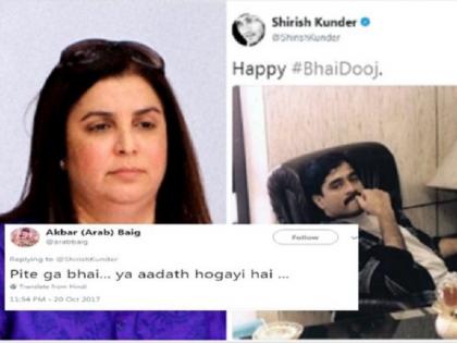 भ ऊबीजेला सगळ्यांनी आपल्या भावांची आठवण झाली. पण बॉलिवूड अभिनेत्री, दिग्दर्शक, कोरिओग्राफर फराह खान हिचा पती शिरीष कुंदर याला मात्र भाऊबीजेच्या दिवशी भलत्याचीच आठवण झाली आणि मग सोशल मीडियावर शिरीषला ट्रोल व्हावे लागले. २१ आॅक्टोबरला शिरीषने भाऊबीजेच्या शुभेच्छा दिल्या. पण या शुभेच्छा देताना त्याना काय दुर्बुद्धी सुचली ठाऊक नाही. भाऊबीजेच्या शुभेच्छा देताना त्याने दाऊद इब्राहिमचा फोटो पोस्ट केला. मग काय, नेटिजन्सनी त्याला चांगलेच आडव्या हातांनी घेतले.