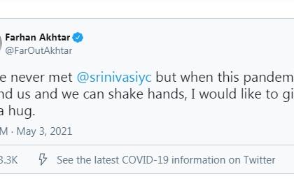 ‘मी कधी श्रीनिवास बीव्ही यांना भेटलेलो नाही. पण ही महामारी संपताच मी नक्कीच तुम्हाला भेटेन आणि तुम्हाला मीठी मारेन,’ असे ट्विट फरहानने केले.