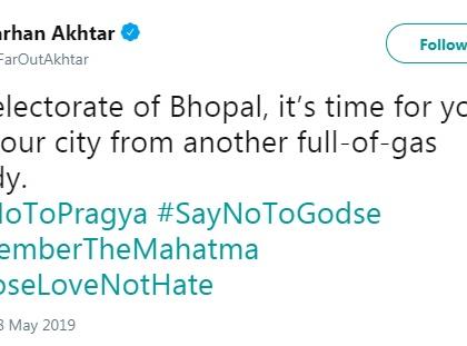 फरहानने काल भोपाळच्या मतदारांना मतदान करण्याचे आवाहन केले. ‘भोपाळच्या मतदारांनो, तुमच्या शहराला आणखी एका वायूकांडापासून वाचवण्याची हीच वेळ आहे,’असे ट्वीट फरहानने केले.