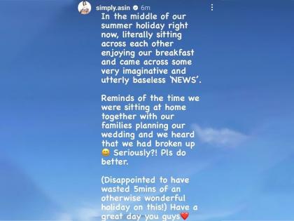 अभिनेत्री असिनने इंस्टाग्राम स्टोरीवर पोस्ट शेअर करत घटस्फोटाच्या चर्चेला पूर्णविराम लावला आहे. तिने म्हटले की, आता आमच्या उन्हाळ्याच्या सुट्टीच्या मध्यावर, अक्षरशः एकमेकांच्या समोर बसून नाश्त्याचा आस्वाद घेत असताना काही अत्यंत काल्पनिक आणि पूर्णपणे निराधार 'बातम्या' समोर आल्या. आम्ही आमच्या कुटुंबासह घरी बसून आमच्या लग्नाची योजना आखत होतो. त्या वेळेची आठवण करून देत होतो आणि आमचे ब्रेकअप झाल्याचे ऐकले. सिरियसली?! कृपया यापेक्षा चांगलं करा. (अप्रतिम सुट्टीतील ५ मिनिटं वाया घालवल्याबद्दल निराश झालो!) तुमचा दिवस चांगला जावो.