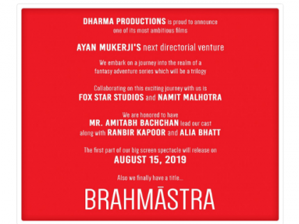 कारण जोहर ने आपल्या ट्विटर अकाऊंटवर हे ही जाहीर केले की 'ब्रह्मस्त्र' चा पहिला भाग १५ ऑगस्ट २०१९ ला रिलीज केला जाईल. आपणास सांगू इच्छितो की फार दिवसापासून आलिया भट्ट आणि रणबीर कपूर एकाच चित्रपटात दिसणार असल्याच्या बातम्या येत होत्या. या चित्रपटासाठी रणबीरने घोडेस्वारी आणि जिम्नॅस्टिकची ट्रेनिंग घ्यायला सुरुवात सुद्धा केली आहे. या चित्रपटाचे नाव आधी 'ड्रॅगन' असे होते. अयान मुखर्जी भरपूर दिवसांपासून या चित्रपटाच्या स्क्रिप्टवर काम करत होते . ज्यामध्ये एक सुपरहिरो आहे आणि त्याच्याकडे अद्नभुत शक्ति आहे. या कथेला अनुसरून करण जोहरने या चित्रपटाचे नाव 'ब्रह्मस्त्र' असे ठेवले आहे. हा चित्रपट ३ भागात बनणार आहे. ज्याचा पहिला भाग २०१९ मध्ये रिलीज होईल.पहिल्यांदाच आलिया आणि रणबीर एकत्र स्क्रिन शेअर करताना दिसणार आहेत.