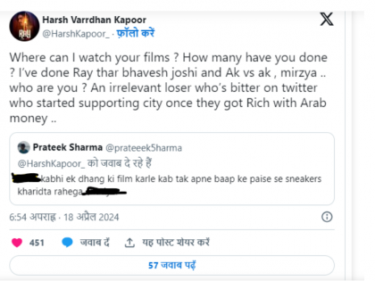 सोशल मीडियावर एक स्क्रीनशॉट व्हायरल झालाय. यात अनिल कपूर यांचा लेक हर्षवर्धनला एक युजर म्हणाला की, "कधीतरी एखादा चांगला सिनेमा कर. किती वेळ आपल्या बापाच्या पैशांवर जगत स्नीकर्स खरेदी करशील?" यावर हर्षवर्धनने रिप्लाय दिला की, "मला तुझे सिनेमे कुठे बघायला मिळतील? तू आयुष्यात किती सिनेमे केलेस? मी आतापर्यंत रे, थार, AK vs AK, मिर्झाया, भावेश जोशी हे सिनेमे केलेत? तू आहेस कोण? ज्याचा काही संबंध नाही असा एक अपयशी माणून जो फक्त ट्विटरवर गरळ ओकतो आणि लोकं श्रीमंत झाली म्हणून त्यांना सपोर्ट करतो."