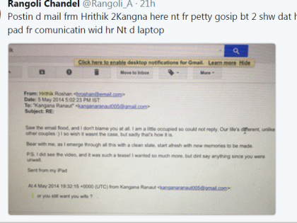 या ईमेलचा स्क्रिनशॉट रंगोलीने शेअर केला आहे.‘ हा स्क्रिनशॉट कुठलेही गॉसिप्स उभे करण्यासाठी नाही. हे ईमेल्स लॅपटॉपवरून नाही तर आयपॅडवरून लिहलेआहेत, हे मला सांगायचेय. हृतिकने आपला लॅपटॉप फॉरेन्सिक इनव्हेस्टिगेशनसाठी दिलाय. आयपॅड दिलेला नाही. विचार करा का? ’असे टिष्ट्वट रंगोलीने केले आहे. पुढचा वार करताना रंगोलीने कंगना व हृतिकचा एक जुना फोटो शेअर केला आहे. ‘कंगनाने फोटोशॉप्ड फोटो पब्लिक केला,असा तुझा आरोपआहे. तू याच फोटोबद्दल बोलत असशील तर तो कुणी रिलीज केला, ठाऊक नाही.