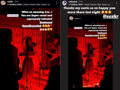सुझैन खान(Sussanne Khan)ने तिच्या इन्स्टा स्टोरीवर एक फोटो शेअर केला आहे, ज्यामध्ये तिने कॅप्शन देताना सबा आझादचे कौतुक केले आहे. हा फोटो मुंबईतील जुहू येथील सोहो हाऊसचे आहे, जिथे साबा आझादने परफॉर्म केले होते. तिचा परफॉर्मंस पाहून सुजैन खान इतकी खूश झाली की तिने हृतिक रोशनच्या खास मैत्रिणीवर कौतुकाचा वर्षाव केला. सुझैन खानने फोटोसोबत कॅप्शनमध्ये लिहिले, 'किती छान संध्याकाळ. तू खूप मस्त आहेस आणि सबा आझाद खूप प्रतिभावान आहेस.