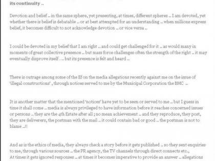 अ िताभ बच्चन आपल्या मनातील गोष्टी अनेकदा सोशल मीडियावर शेअर करत असतात. आता पुन्हा एकदा त्यांनी असाच एक लांबलचक ब्लॉग लिहिला आहे. या ब्लॉगची सुरूवात त्यांनी धर्म, आस्था आणि तर्क या विषयांपासून केली. पण पुढे याच ब्लॉगमध्ये त्यांनी मीडियाच्या कामाची समीक्षा केली आहे. केवळ इतकेच नाही तर बीएमसीने त्यांना पाठवलेल्या अवैध बांधकामाच्या नोटीसचाही उल्लेख केला आहे. याच ब्लॉगमध्ये त्यांनी मीडियाच्या स्वातंत्र्यावरही प्रश्नचिन्ह उपस्थित केलेयं.