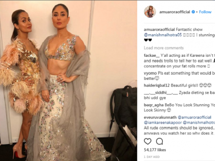 क िना कपूरला स्टाईल आयकॉन म्हणून ओळखले जाते. तिचा फॅशन सेन्सही जबरदस्त आहे. स्वत:ला मेंटेन ठेवण्यासाठी करिना प्रचंड मेहनत घेते. म्हणूनच तिचा अधिकाधिक वेळ जिममध्ये जातो. याचा पुरावा करिनाच्या सोशल अकाऊंटवर तुम्हाला पाहायला मिळू शकतो. करिनाचे सोशल अकाऊंट वर्कआऊटचे फोटो आणि व्हिडिओने भरलेले आहे. एकंदर काय तर करिना तिच्या फिटनेस आणि अंदाजामुळे कायम चर्चेत असते. पण अलीकडे करिनाला याच फिटनेसमुळे ट्रोल व्हावे लागले. होय, अलीकडे फॅशन डिझाईनर मनीष मल्होत्रासाठी करिना सिंगापूरमध्ये रँप वॉक करताना दिसली. या शोनंतर करिनाने तिची बेस्ट फ्रेन्ड अमृता अरोरासोबतचा एक फोटो सोशल मीडियावर शेअर केला.