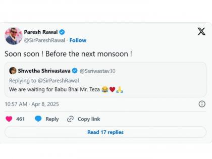 मंगळवारी एक्स अकाउंटवर एका अनौपचारिक संभाषणादरम्यान, एका चाहत्याने परेश रावल यांना 'हेरा फेरी ३' चित्रपटाच्या प्रदर्शनाबद्दल प्रश्न विचारला. अभिनेत्यानेही खूप मजेशीर पद्धतीने उत्तर दिले, "लवकरच! पुढच्या पावसाळ्यापूर्वी!" असे लिहिले. आता चाहते असा अंदाज लावत आहेत की हा चित्रपट २०२६ च्या पहिल्या सहामाहीत थिएटरमध्ये येऊ शकतो.