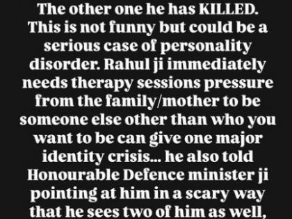 कंगनाने सोशल मीडियावरही पोस्ट शेअर करत राहुल गांधींवर टीका केली. "राहुल गांधींनी ताबडतोब काही थेरपी घ्यावी. अनेक मानसशास्त्रज्ञ सहमत असतील की, आपल्या इच्छेच्याविरुद्ध आई किंवा कुटुंबाच्या दबावामुळे आपण एखादी गोष्ट करतो, तेव्हा अशी परिस्थिती निर्माण होते", असं ती म्हणाली.