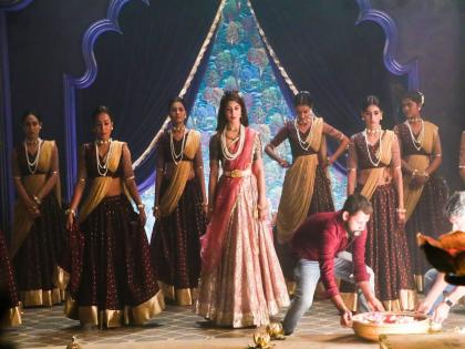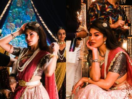 जॅकलिनने कमीत कमी मेकअप, मोतींच्या माळा, मांग टीक्का आणि कंबरबंध सोबत लूक पूर्ण केला आहे, हेअरस्टाईलचं सांगायचं तर तिने केस मोकळे ठेवले आहेत. जॅकलिनने सेटवर स्टायविश पोझ दिले आहेत.
