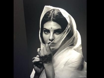 या नव्या ब्लॅक अँड व्हाईट फोटोमध्ये जॅकलिन साडीमध्ये आहे. कमीत कमी मेकअप, ट्रेडमार्क आॅयलाइनर, छोटी गोल बिंदी आणि चेह-याचा भाग पदराने झाकलेला अशा अवतारात ती दिसतेयं.
