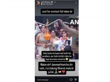 दहीहंडीच्या इव्हेंडमधला व्हिडीओ जान्हवीने तिच्या इन्स्टाग्राम स्टोरीमध्ये पोस्ट केला आहे. या व्हिडीओत भाजपा आमदार राम कदम "बोलो भारत माता की जय" अशा घोषणा देत आहेत. त्यानंतर ते जान्हवीलाही घोषणा देत दहीहंडी फोडण्यासाठी सांगत असल्याचं व्हिडीओत दिसत आहे. दहीहंडी कार्यक्रमातील जान्हवीचा हा व्हिडीओ व्हायरल करत नेटकऱ्यांनी तिला ट्रोल केलं होतं. स्वातंत्र्यदिन आणि दहीहंडी एकाच दिवशी साजरा केल्याचं म्हणत जान्हवीला ट्रोल करण्यात आलं होतं. त्या ट्रोलर्सला जान्हवीने चांगलंच सुनावलं आहे.