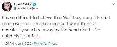 वाजिद खान यांच्या निधनावर दु:ख व्यक्त करत जावेद अख्तर यांनी एक ट्विट केले होते, त्याच्या या ट्विटवर एका युजरने वादग्रस्त कमेंट केली आणि जावेद अख्तर भडकले.